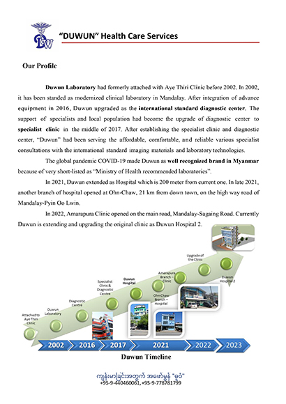 ဓူ၀ံဓာတ္ခြဲခန္းသည္ မႏၱေလးျမိဳ႕၏ ႏိုင္ငံတကာအဆင့္မီ ပထမဆံုး ဓာတ္ခြဲခန္းအျဖစ္ ရပ္တည္ခဲ့ပါသည္။ ယခုအခါ အထူးကု ေဆးခန္းအျဖစ္သို႔ ၂၀၁၇ ခုႏွစ္တြင္ တိုးခ်ဲ႕ခဲ့ပါသည္။